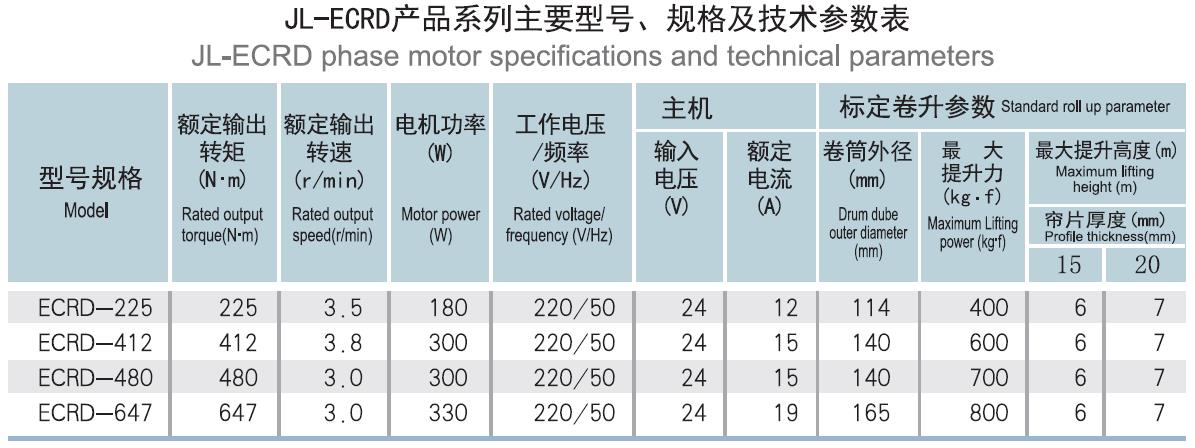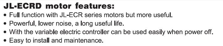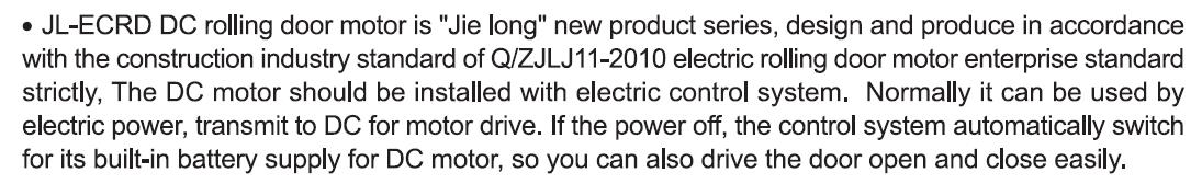 描述: JL-ECRD DC rolling door motor is "Jie long" new product series, design and produce in accordancewith the construction industry standard of Q/ZJLJ11-2010 electric rolling door motor enterprise standardstrictly, The DC motor should be installed with electric control system, Normally it can be used byelectric power, transmit to DC for motor drive. lf the power off, the control system automatically switchfor its built-in battery supply for DC motor, so you can also drive the door open and close easily.